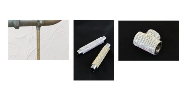 「水回り製品を華やかにすることで、少しでも業界に興味をもってもらいたい」との思いから、ラインストーン専門メーカーのアルファライン(大阪府茨木市)に協力を依頼して開発。給排水部材などの水回り製品に簡単に貼り付けることができる。10x10cmのシートには約2000個のラインストーンが配されている。