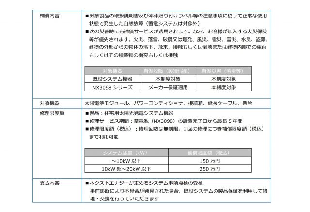 太陽光発電システム所有者が購入した場合、既設の太陽光発電システム機器の自然故障を最長5年間補償(10kW以下は上限150万円、10kW超〜20kW以下は上限250万円)。さらに、既設の太陽光発電システムと今回の蓄電システムに5年間の自然災害補償を付帯する。蓄電システムの追加工事により保証切れとなった場合の機器故障や、火災保険等が適用にならない場合の復旧修理にも補償サービスが利用できるとする。