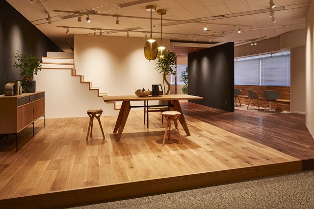 横浜ショールーム内観。靴を脱いで床材の素材感を体感できる