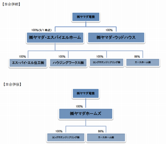 ヤマダ・エスバイエルホーム(群馬県高崎市)は、10月1日(予定)を効力発生日として、ヤマダ・ウッドハウス(同)および連結子会社2社(エス・バイ・エル住工、ハウジングワークス)の吸収合併を取締役会で決議した。存続会社の商号も「株式会社ヤマダホームズ」に変更する。