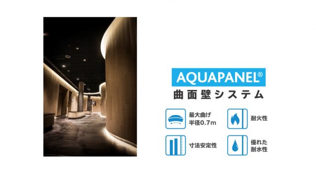 ドライ工法で最大曲げ半径700mmまで施工可能な曲面壁システム。耐水性にすぐれるため、水まわりや高湿潤環境における内壁、間仕切り壁、柱などに使うことができる。 また、1時間耐火間仕切り壁の「AQUAPANEL WALL」と組み合わせることで、曲げ半径1mの耐火間仕切り壁にも対応する。 ●ニュースリリースはコチラ