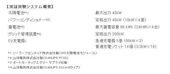 同システムは、太陽電池で発電した電力を、同社内に設置した日産リーフ4台分のリチウムイオンバッテリーを使用した蓄電装置に蓄電し、電気自動車の充電に利用するもの。