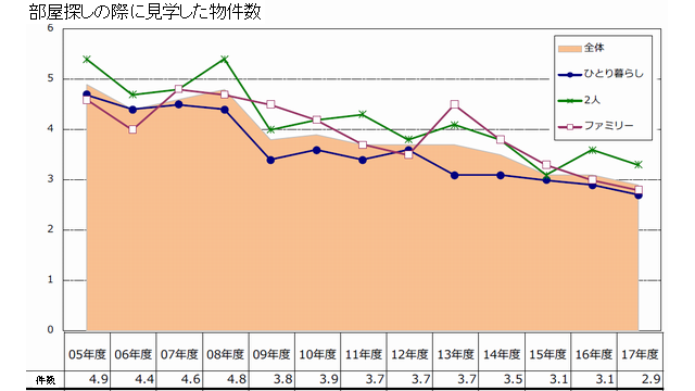 リクルート住まいカンパニー(東京都港区)は9月5日、賃貸物件を契約した人を対象に実施した「2017年度 賃貸契約者動向調査(首都圏)」(2018年5月実施)の結果を発表した。それによると、不動産会社店舗への訪問数は平均1.6店舗と減少傾向にあり、物件の見学数は平均2.9件で過去最少となった。