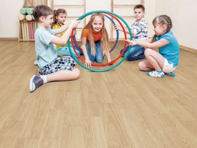 厚さは3.2mm。表面に細かな凹凸加工をほどこすことで汚れを浮かせ、油性ペンが付いても乾拭き程度で汚れを落とすことができる。 また、裏面を発泡層構造とし、適度なクッション性をもたせた。足・ひざへの衝撃を吸収し、歩行時の負担を減らすため、高齢者施設や児童施設に適するという。 6色。4900円/m2。