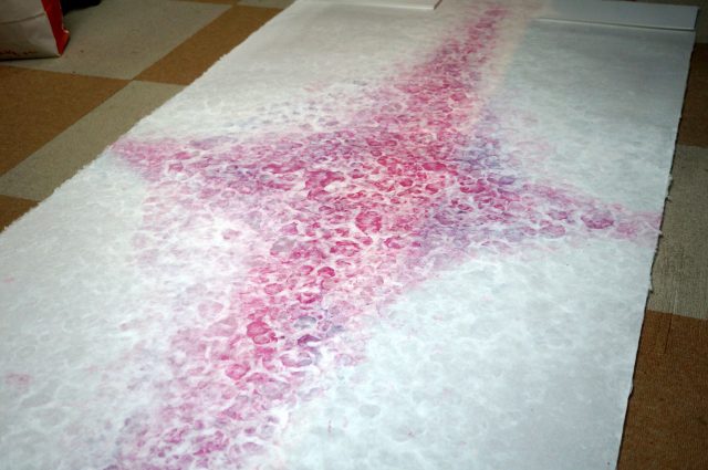商業空間を彩るインテリア向けに開発したという「彩襖」は、原料の素材感、光の透け感や陰影、色彩・模様を、伝統技法と現代的なデザイン表現を組み合わせてアレンジし、職人が手づくりするもの。