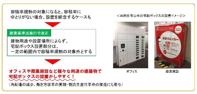 宅配ボックスをオフィスや商業施設などに設置しやすくするため、建物用途や設置場所によらず宅配ボックス設置部分を延べ床面積100分の1以内で容積率規制の対象外とする建築基準法施行令を9月25日に施行する。容積率規制の対象になると容積率に余裕がないと設置を断念するケースがあるため。