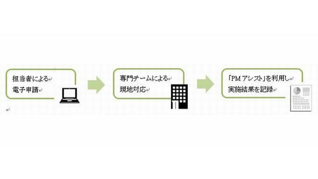 各マンションの担当者から依頼を受けた専門チームは現地での対応後、点検結果を記録する専用ツール「PMアシスト」を利用して実施結果を報告する。