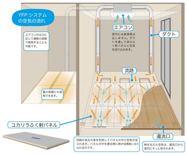 エアコンの温風/冷風をダクトを通して床下にある「ユカリラふく射パネル」に送り込み、温風/冷風がパネル内を通る間に熱がパネル表面の金属板に伝えられ、床仕上げ材の表面から輻射熱として暖かさ・涼しさを室内に届ける。