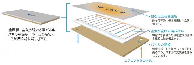 「ユカリラふく射パネル」の基材はパーティクルボードで、流路部分はPP板、表面は金属板。