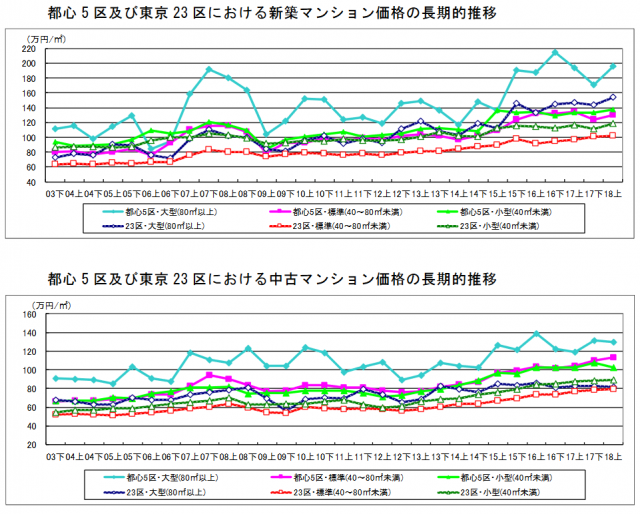 一般財団法人日本不動産研究所(東京都港区)は9月13日、東京23区におけるマンションの市場動向を調査・集計した「住宅マーケットインデックス2018年上期」の結果を発表した。それによると、東京23区および都心5区(港区・千代田区・中央区・新宿区・渋谷区)の新築マンション価格は、「大型タイプ(80m2以上)」「標準タイプ(40~80m2未満)」「小型タイプ(40m2未満)」のすべてで上昇した。