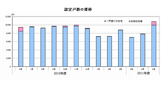 国土交通省は7月15日、長期優良住宅建築等計画の6月末時点での認定状況を発表した。6月単月の認定戸数は、戸建て住宅が9958戸、共同住宅等が842戸で、合計1万800戸だった。単月の認定戸数が1万戸を超えたのは制度開始以来初めて。