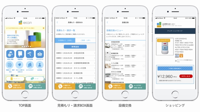 月額1000円で、住宅設備の不具合を何度でも修理可能なサービスを中心に提供。築年数や戸建て・マンションを問わず24時間365日対応可能で、工務が煩雑な修理対応を不要としながら、顧客との長く続く関係づくりに活用できる。修理費用は、製造年に応じて割引を行うため実質無料。新品交換が必要な場合は、交換費から3万~10万円値引きすることで、アプリを通じての受注にもつなげていく。対象設備は、給湯器・システムキッチン・システムバス・温水機能便座。