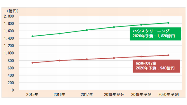 ハウスクリーニングサービスと家事代行業はともに、共働き世帯や高齢者世帯の増加を受けて市場を拡大している。ハウスクリーニング市場は、エアコン、レンジフード清掃などの需要がけん引。2020年の市場は1820億円(2017年比12.3%増)を見込む。家事代行業については、従来型事業者よりも低額で利用できるEC専業事業者の増加にともない、若年層を中心に需要が増加。2020年の市場は940億円(同13.3%増)と予測する。