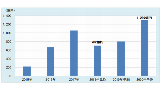 民泊サービス市場は急成長してきたが、2018年6月に住宅宿泊事業法(民泊新法)が施行されたことで一時縮小すると予測。2018年の市場は前年比33.5%減の702億円を見込む。新法における申請手続きの煩雑さや年間営業日数の上限による採算性の低下などにより、サービス提供から撤退する個人事業者が出てきているものの、堅調な需要で2019年には回復に向かうとみられる。2020年の市場は2017年比22.9%増の1297億円になると予測。