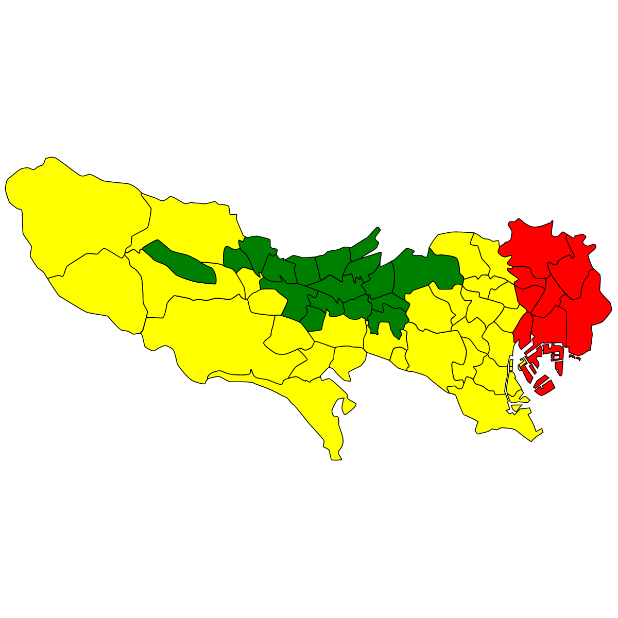 23区では練馬区が1位(80.59点、東京都では16位)。川沿いの人工造成地を除いてはほぼ安全な場所が多いことから、23区での首位となった。2位は杉並区(77.32点、同23位)、3位は豊島区(74.90点、同28位)だった。