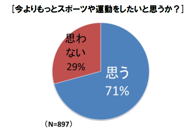 今よりもっと運動をしたいと思うか尋ねたところ、71%が「思う」と回答。運動の有無別でみると、定期的な運動があまりできていない層ほど今後の運動意向が高いことがわかった。運動で重視することについては、「無理なく続けられる」(72%)、「健康面・身体面での効果が実感できる」(66%)、「精神面での効果」(39%)などの回答が上位となった。