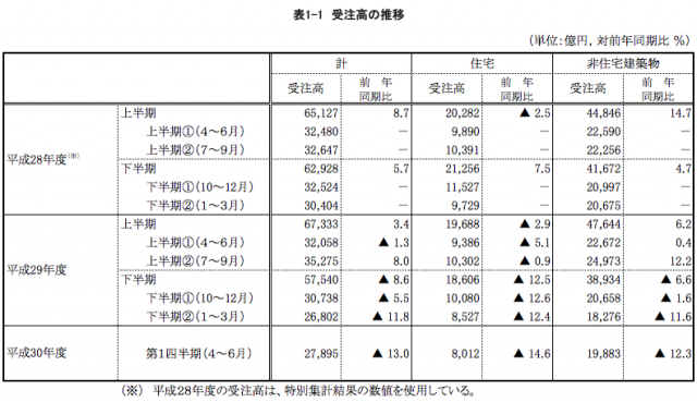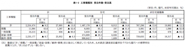 住宅の工事種類別の受注高をみると、「増築」が同51.0%減の197億円、「一部改築」が同52.2%減の180億円、「改装・改修」が同13.4%減の6026億円、「維持・修理」が同2.6%減の1609億円だった。