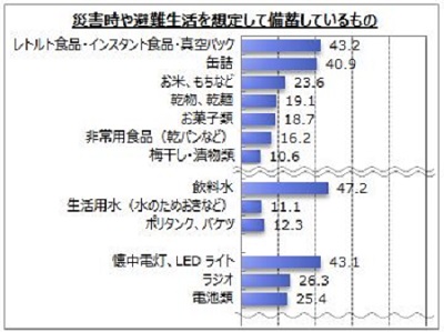 マイボイスコム(東京都千代田区)は10月2日、2回目となる「防災用品に関するアンケート調査」の結果を発表した。それによると、災害時や避難生活を想定して備蓄している人は全体の7割強だった。備蓄品は「レトルト食品・インスタント食品」「缶詰」「飲料水」といった食品や「懐中電灯、LEDライト」がそれぞれ40%台だった。東北では「カセットコンロ・IHコンロ、ガスボンベ、固形燃料」「ラジオ」の割合が他地域より高くなっている。