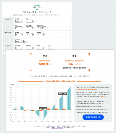 不動産情報サイト「LIFULL HOME’S」を提供するLIFULL(東京都千代田区)は、マンションの参考価格や価格推移、市場ニーズを調べられるサービス「見える!不動産価値」に物件を売却した場合と賃貸に出した場合の収支を比較できるシミュレーションサービスの提供を開始した。