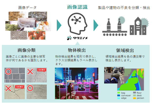 ALBERT(アルベルト、東京都新宿区)は10月3日、人工知能(AI)とディープラーニング技術を用いたAI・画像認識サービス「タクミノメ」の提供を開始した。企業が用意した画像データを使い、精度の高い画像認識モデルの構築を支援する。建築物の外観検査などに活用可能で、実導入・運用に向けた計画を立てやすくなるという。