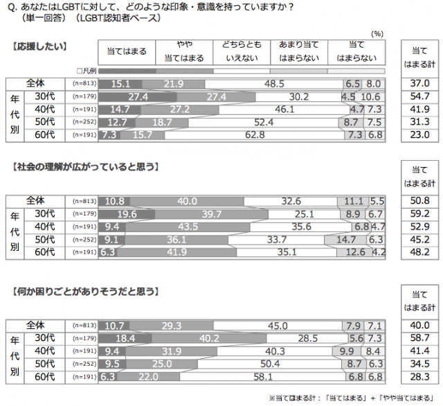 不動産オーナーのLGBT(レズビアン、ゲイ、バイセクシュアル、トランスジェンダー)という言葉の認知度は79.4%だった。年代別の認知度では、30代オーナーが89.1%と最も高く、年代が上がるにつれて認知が低くなった。LGBTを「応援したい」というオーナーは37.0%だった。