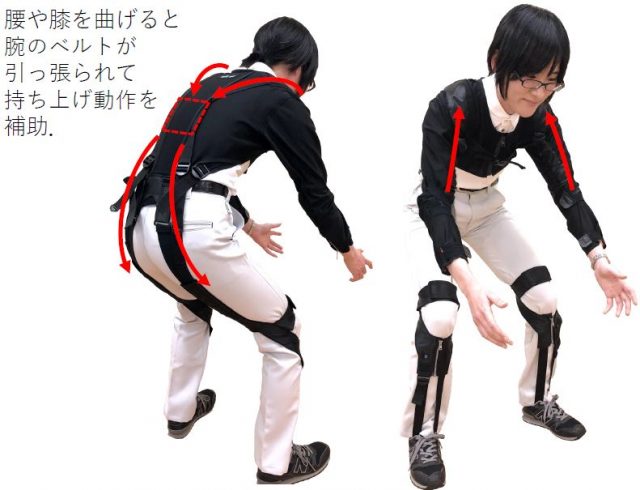 早稲田大学理工学術院の田中英一郎(たなかえいいちろう)教授の研究グループは、旭蝶繊維(広島県府中市)と共同で、持ち上げ動作時にゴムベルトおよび布の変形収縮により腕と腰を補助するスーツ「e.z.UP・イージーアップ」を開発した。