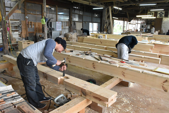 同社には「本物の木材を扱える本物の大工技術を学びたい」と入社を希望する若者が後を絶たない。そんな若者に対し澤口さんは信頼を置くベテランの棟梁たちとともに、まず「道具のつくり方」や大きな部材を使いまわせる「体づくり」を指導する。