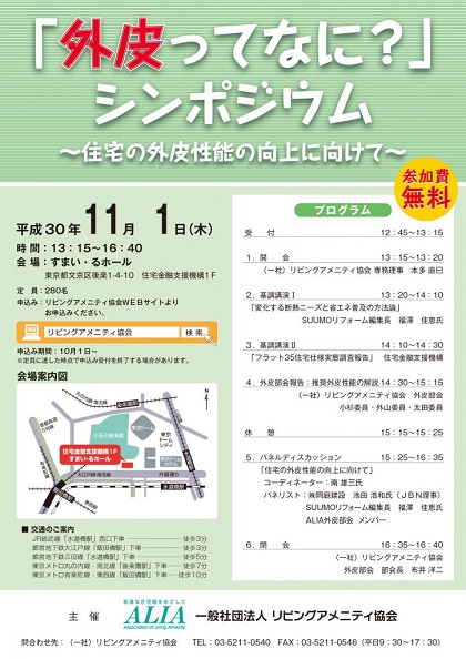 一般社団法人リビングアメニティ協会(ALIA、東京都千代田区)は、「『外皮ってなに?』シンポジウム~住宅の外皮性能の向上に向けて~」を11月1日にすまい・るホール(東京都文京区)で開催する。
