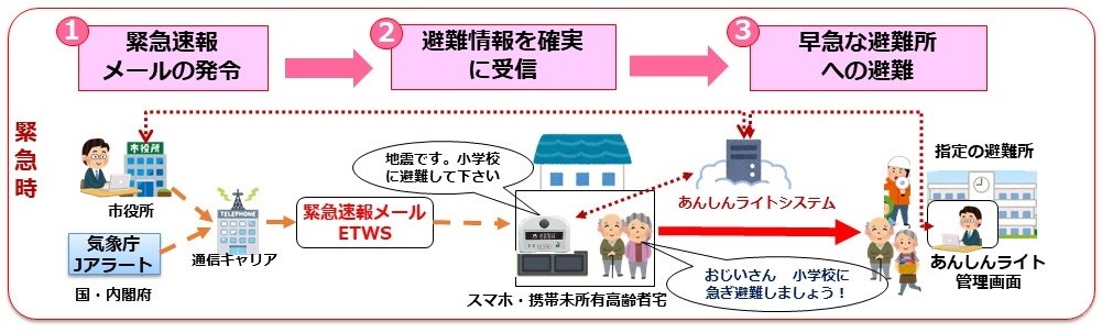 緊急速報や自治体からの避難情報を自動で受信。発光、吹鳴、表示、音読の4つの方式で報知する。高齢者や障がい者にも使いやすい戸別送受信機で、利用者の操作情報を送信する機能により、住民が情報を受信確認したかの把握が可能。自宅に置くだけで災害情報等を受発信できるため、スマートフォンを持たない高齢者の見守り用途として提供することができる。