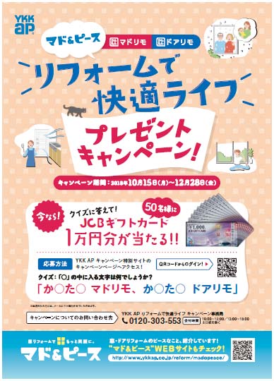 YKKAP(東京都千代田区)は、冬を暖かく暮らすために有効な窓・ドアリフォームの需要創造を目的に各種プロモーション活動を展開。昨年から、「マド&ピース」をキーワードに窓・ドアリフォームの重要性を発信している。その一環として「リフォームで快適ライフ プレゼントキャンペーン」を10月15日からスタートした。