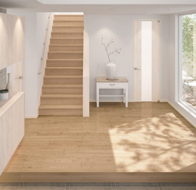 床材と同じ9柄に加え、蹴込・巾木などの垂直面にはモダンに仕上がる白系2色を設定している。