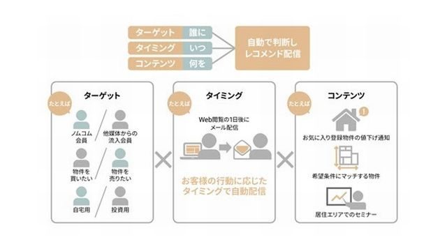 同社が運営する不動産情報サイト「ノムコム」に、ブレインパッド(東京都港区)が提供するBtoC向けマーケティングオートメーションツール「Probance(プロバンス)」を導入。ウェブ上で取得するデータをもとに、AIが顧客一人一人の「興味のある物件カテゴリ」や「アクセスしやすい時間帯」などを予測し、最適なタイミングでメールを配信するという。営業店における接客情報などオフラインデータも取り込むことで、心地よいパーソナライズコミュニケーションの実現を目指すとしている。