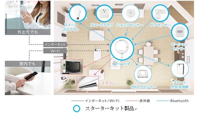 スマートフォンにアプリをインストールし、各機器を連携させてコントロールする「ルームハブ」をセットすることで、エアコンやテレビの遠隔操作、スマートLEDライトの点灯・消灯、ドアや窓の閉め忘れの感知と通知などが可能となる。取り付け工事は不要のため、賃貸住宅でも手軽に「スマートホーム」を体験することができる。