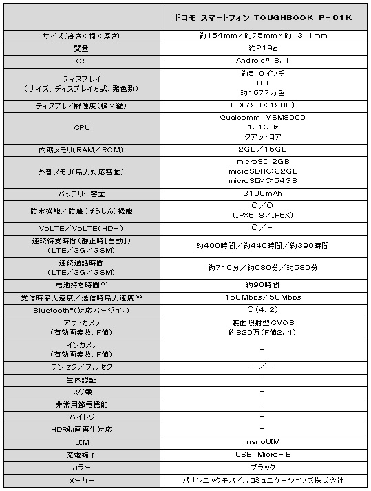 NTTドコモ(東京都千代田区)は10月29日、耐衝撃・防塵・防滴・防水性能を備え、さまざまな環境下で使えるビジネス向けスマートフォン「TOUGHBOOK P-01K」を発売する。