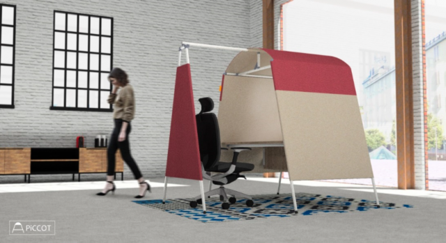 パーティション(間仕切)メーカーのコマニー(石川県小松市)はこのほど、自社の空間デザインの知見とパートナー企業のテクノロジーを組み合わせ、デスクワーカーの創造性を高めるブースのプロトタイプ「PiCCOT(仮称:ピコット)」を開発した。Kokorotics(大阪市北区)、富士通クラウドテクノロジーズ(東京都中央区)と共同開発したもの。