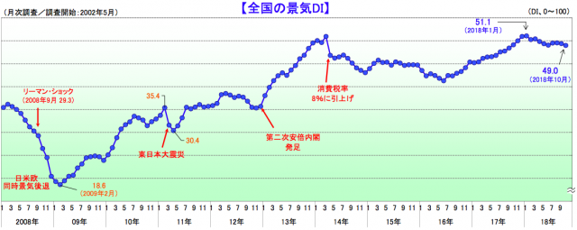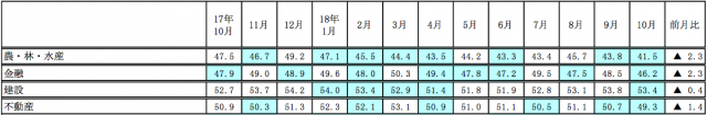 帝国データバンク(東京都港区)は11月5日、全国企業の景気判断を総合した景気動向指数(DI)に基づく「TDB景気動向調査(全国)」の10月調査結果を発表した。全体の景気DIは前月比0.4ポイント減の49.0で2カ月連続の悪化となった。業界別では、建設業が同0.4ポイント減の53.4で今年4月以来半年ぶりの悪化、不動産業が同1.4ポイント減の49.3ポイントで2カ月連続の悪化となった。