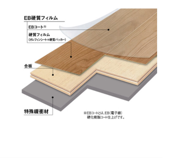 製品は、フロア台板に施した特殊加工と裏面に貼った緩衝材で構成。コンクリートスラブに直貼りしても、畳や2重床と同等の衝撃吸収性を持ち、屋内における転倒時の衝撃を吸収し、子どもや高齢者を怪我から守る。