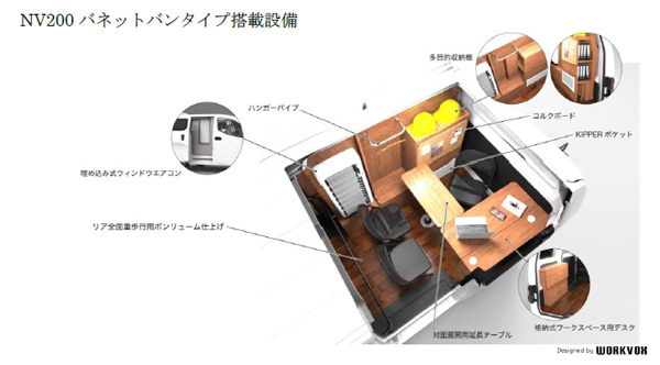 商品のポイントは、「業務の効率化と労働時間の短縮」として、移動先での事務処理を可能にして会社へ戻るための移動時間を削減。「小規模現場に有効」として、事務所がない現場にも効果的。「周辺環境に配慮」として、長時間使用を考慮して外部電源取込口の設置により騒音や排気ガスなどの環境への対応。「快適な作業環境」として、収納棚・テーブル・エアコンなど快適に事務処理が行える機能を搭載している。