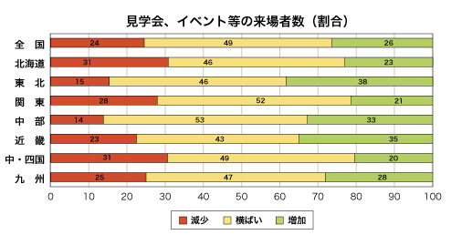 見学会、イベント等への来場者数は、『増加』の回答が前四半期の33%から26%に下がり、『減少』が18%から24%に上がり、来場者数の伸びは鈍化した。引き合い件数は、『増加』が28%から16%に下がり、『減少』は13%から25%に上がり、回復傾向から減少傾向に転じた。
