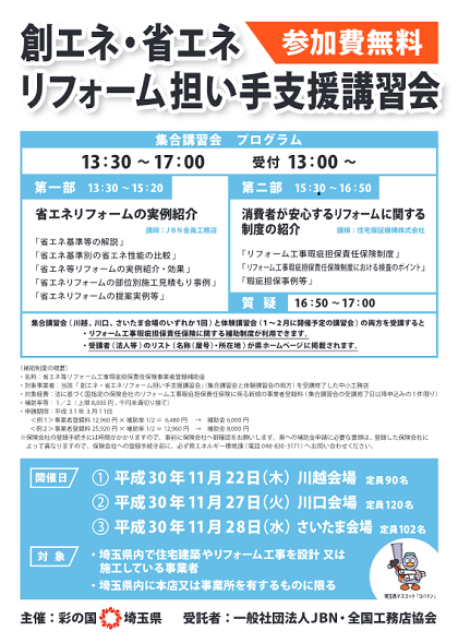 埼玉県は、県内で住宅建築やリフォーム工事を設計・施工している事業者を対象にした「創エネ・省エネリフォーム担い手支援講習会」を11月22日から開催する。業務受託者は一般社団法人JBN・全国工務店協会(東京都中央区)。