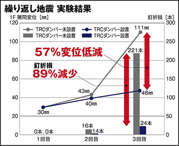 実大実験で示された「繰り返し地震への強さ」。極大地震と繰り返し地震の双方で水平方向への変形が50%程度低減。特に繰り返しの地震では、3回目の釘抜け本数が同時に揺らした耐震住宅に比べわずか10分の1という画期的な結果に。「繰り返し地震への強さ」が実証された