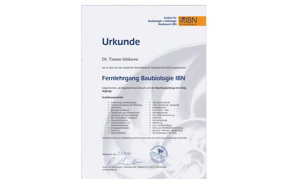 ドイツの研究機関・バウビオロギー+エコロジー研究所ノイボイエルン(IBN)が30年来実施している教育制度を、ライセンス契約にもとづき日本で実施するもの。通信講座の修了者には「バウビオローゲ(建築生物学者)BIJ」の資格が与えられる。