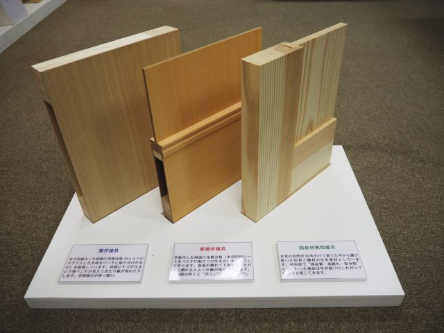 同モデルは、施主に無垢の良さを理解してもらえるように、「無垢建具」「新建材の建具」「フラッシュ戸」の3種類の内部構造が分かるようにしたサンプル。土台の大きさは約39cm×57cm、サンプルの高さは約30cm。販売価格は5000円(送料込み)。納期は目安として3週間程度。