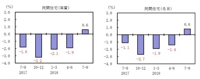 内閣府(東京都千代田区)は11月14日、「2018年7~9月期四半期別GDP速報(1次速報値)」を発表した。実質GDPの成長率は0.3%減(年率1.2%減)で、名目GDPの成長率は0.3%減(年率1.1%減)であった。民間住宅では実質が0.6%増(前期は1.9%減)、名目が0.8%増(前期は1.4%減)と5四半期ぶりにプラス成長を示した。