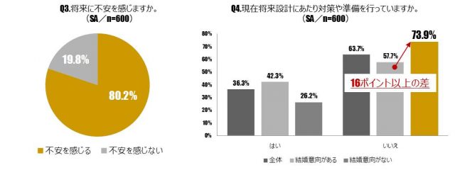 将来への不安の有無については、8割が不安を感じていると答えた。その理由としてもっとも多かったのは、「預貯金」(71.9%)で金銭面への不安を持っていることが浮き彫りになった。将来設計にあたって現在何らかの対策や準備を行っているか、との問いには、6割以上が行っていないと答えた。さらに行っていない人の中でも結婚の意向がある人とない人では、ない人の方が16ポイント以上高かった(下棒グラフ)。