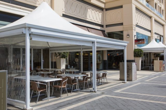 Ziptrakシステムは、左右に柱があれば簡単に設置できるとし、開閉や固定位置の調整も容易。これと耐侯・透明・UVカット・防炎性にすぐれた塩ビフィルムを組み合わせることで、カフェやレストランのオープンデッキ、イベントブースなどで幅広く利用できる。また、地震が多発する日本では、窓ガラスの代替として使用することで二次災害の抑止にもなるという。