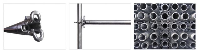 また、支柱同士はフランジが極限まで近接する超密接結束によるコンパクト設計とし、くさび部分の形状と緊結構造を改良することで、足場の組み立て・解体時のハンマーによる打撃音を従来製品(セブン足場)よりも66%軽減した。