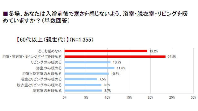 湯まわり設備メーカーのノーリツ(神戸市)は、「ヒートショック」を含む入浴中の死亡事故に関する世代別の意識調査を実施し、その結果を発表した。冬場の入浴時対策に関しては、40~50代(子世代)は「どこも暖めない」(24.7%)が1位。60代以上(親世代)は「浴室・脱衣室・リビングすべて暖める」(23・5%)が1位、「どこも暖めない」(19.2%)が2位となった。親世代でも5人に1人は十分な対策を行っていないことが明らかとなった。