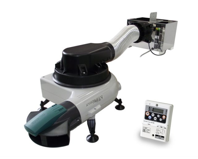 電子式除湿機と拡散送風機を組み合わせ、専用のコントローラで毎日9時〜17時まで自動運転を行う。