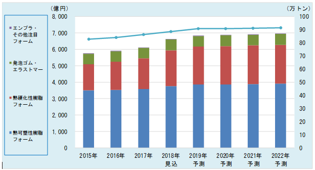 富士キメラ総研(東京都中央区)はこのほど、断熱材需要が増加している発泡プラスチックスの市場を調査し、その結果を「2019年 発泡プラスチックスの現状と将来展望」にまとめた。2022年の発泡プラスチックス34品目の国内市場は、規模の大きい建築資材用途などが拡大をけん引し、2017年比13.7%増の6948億円と予測。高度な断熱性能などにより採用が増加している硬質ウレタンフォームは557億円を見込む。